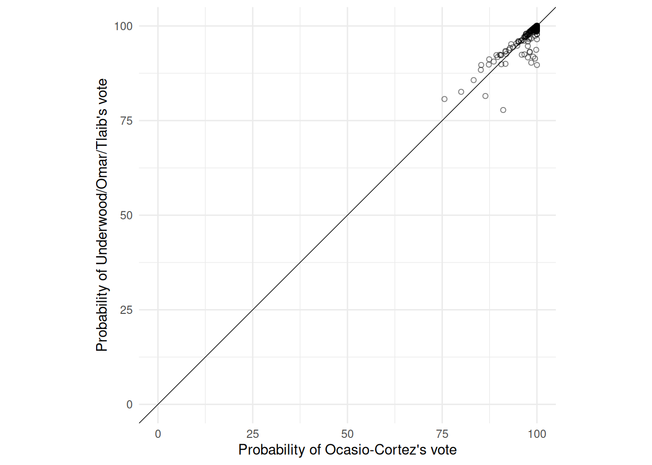 The following plot shows the probability that NOMINATE assigns to votes cast by Ocasio-Cortez against the average probability that it assigns to votes cast by Omar, Tlaib and Underwood on each rollcall in which Ocasio-Cortez, Omar, Tlaib, and Underwood all voted the same way. Here we see that on most of these votes, even with her moderate location, Ocasio-Cortez’s votes are well predicted by NOMINATE. Put another way, we find only a small number of votes for which moving Ocasio-Cortez to a similar location to Omar, Tlaib and Underwood would substantially increase the fit of Ocasio-Cortez’s votes. Thus, while her go-it-alone protest votes provide a strong impetus for NOMINATE to moderate Ocasio-Cortez’s location, the large number of votes on which she agrees with the other liberal Democrats provide little impetus for moving her position leftward.