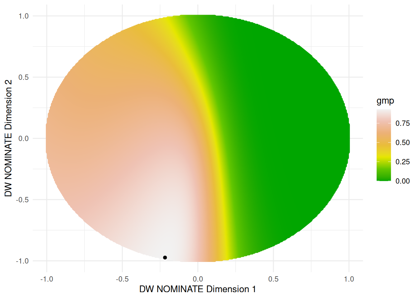 Here we plot the likelihood (represented as the geometric mean probability of her vote choices) of Ocasio-Cortez’s votes being cast by a member located anywhere in the DW-NOMINATE space. Her actual estimated location, the one that maximizes the likelihood of her votes, is represented by the black dot. Note that the likelihood of her votes falls off rapidly as her location is shifted to the right while she can be moved along the edge of the space to the left with relatively less reduction in fit.