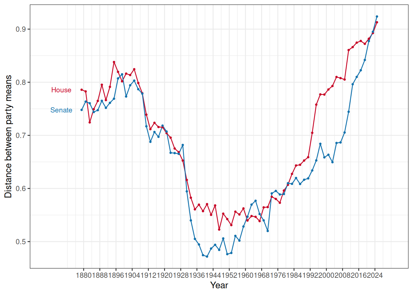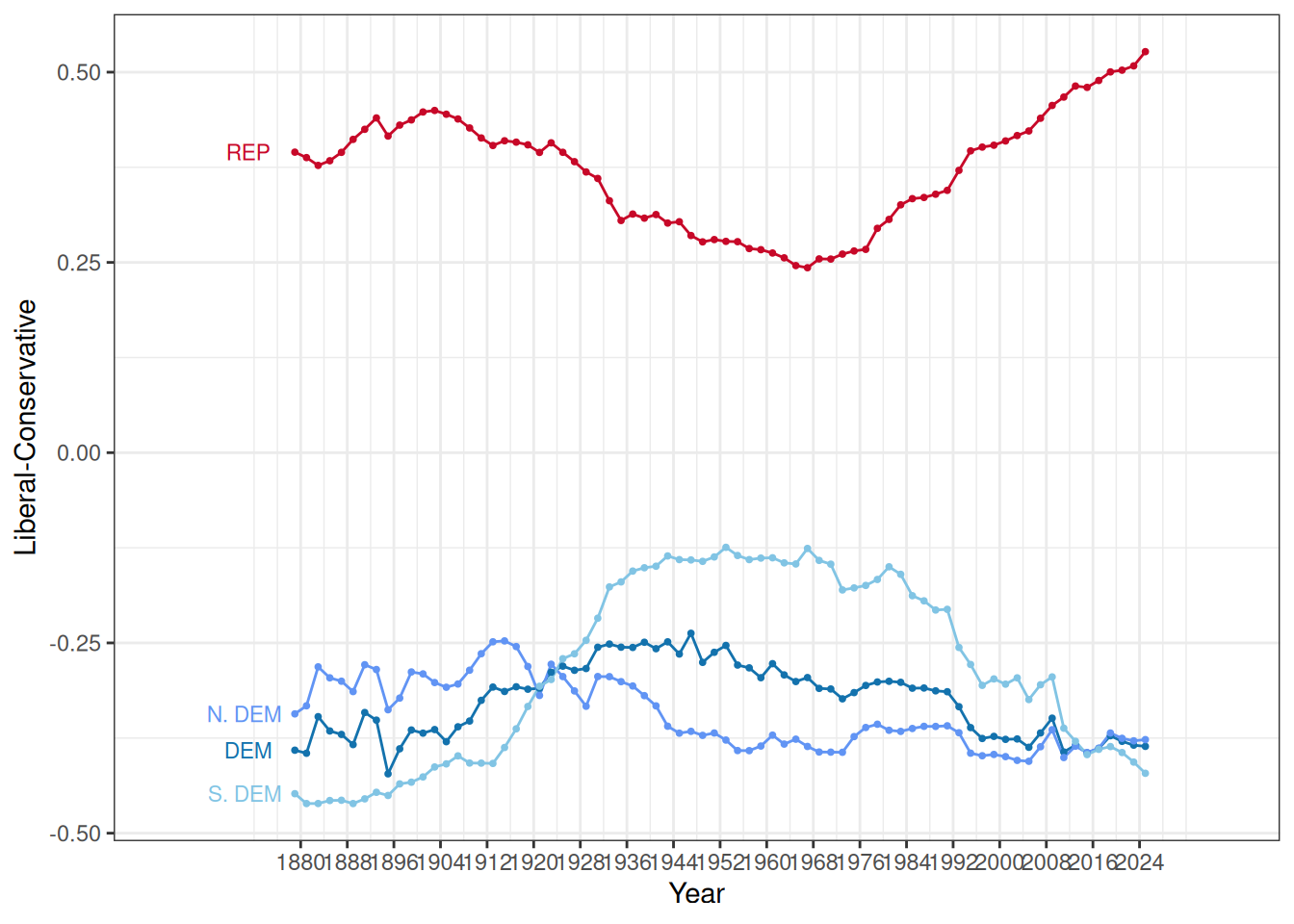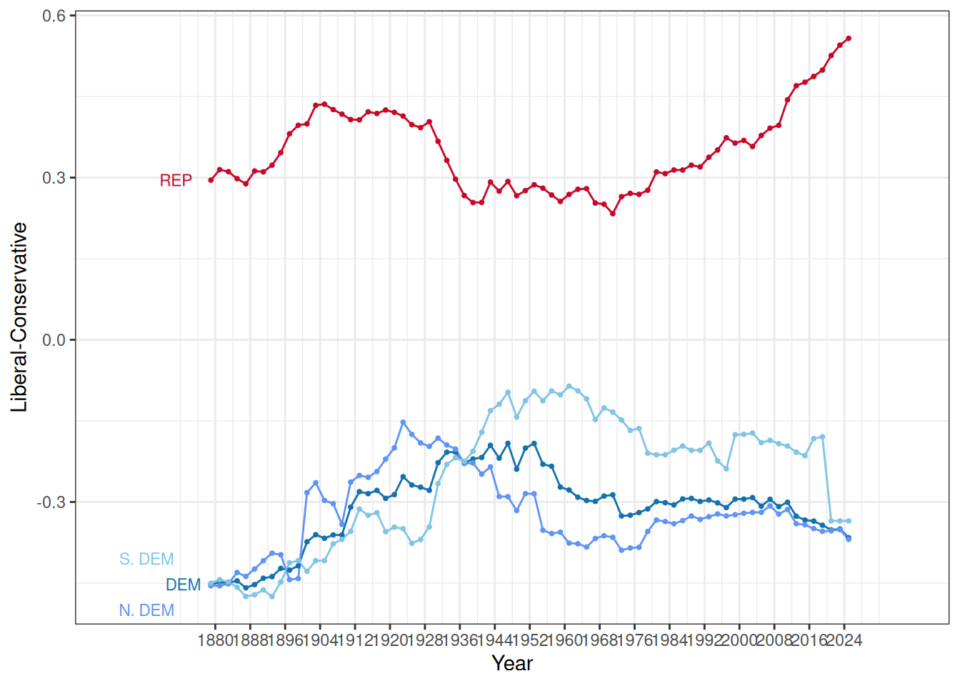 To calculate the mean location of the Northern and Southern Democratic and Republican delegations, we follow Congressional Quarterly in defining the “Southern states” as the 11 states of the Confederacy plus Oklahoma and Kentucky. Note also the Democrats and Republicans are ICPSR party codes 100 and 200 respectively.