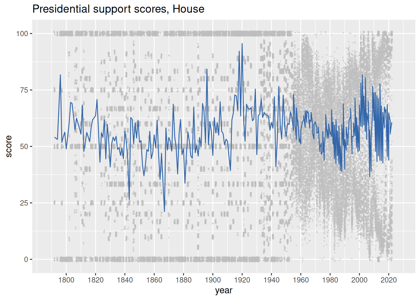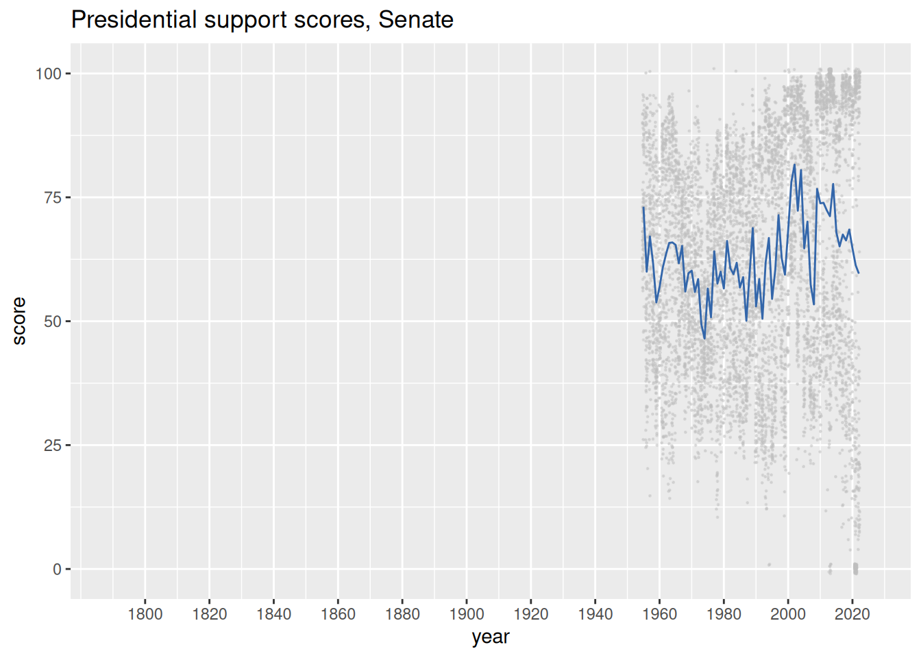 Finally, we plot the presidential support scores for all House members and all Senate members across all years. Each point represents a member in a particular year. The points are “jittered” by small random shocks so that clusters of members with the same score in the same year can be distinguished.