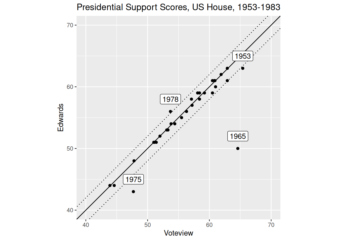 Across the 31 years for which Edwards reports scores, there are only three years in which the difference between what Edwards reports and what we compute based on the Voteview data is greater than 2 percentage points. Those years are 1953, 1965, 1975, and 1978. We have not uncovered the source of these larger discrepancies.