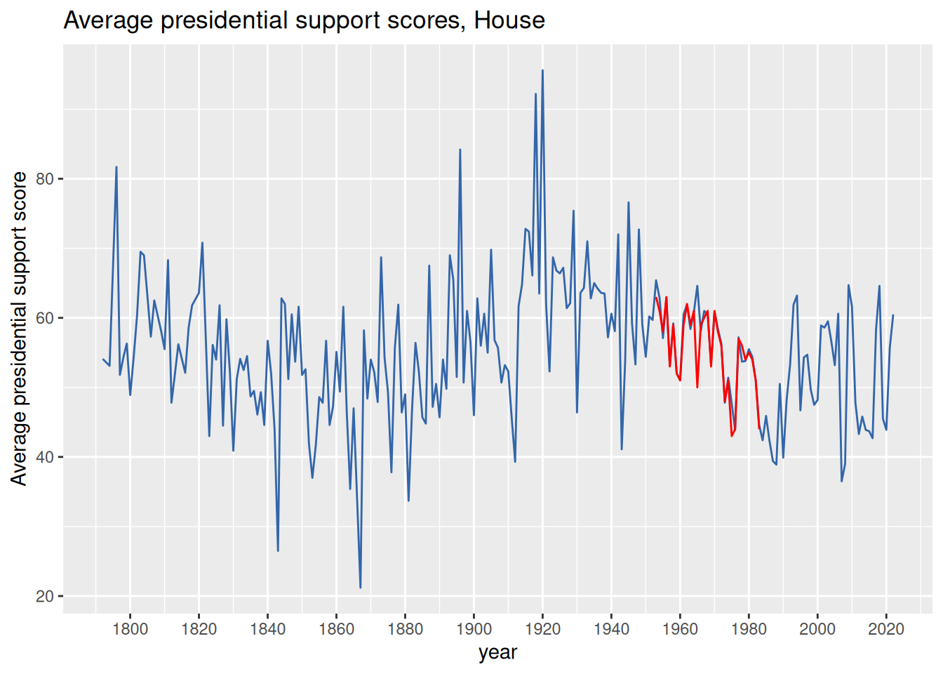 The line plot below show the average level of presidential support in the House over the entire history of the chamber. Edwards’ scores are overlayed in red for comparison in the period for which he reports them. As seen in the previous plot, the only major discrepancy between the two series occurs in 1965.